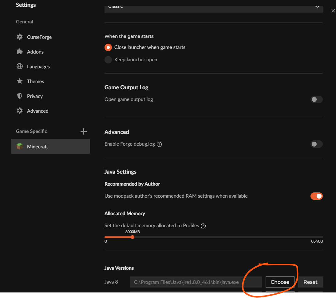 Curseforge users may not have an existing Java 8 version installed. If not, skip to Step 2.