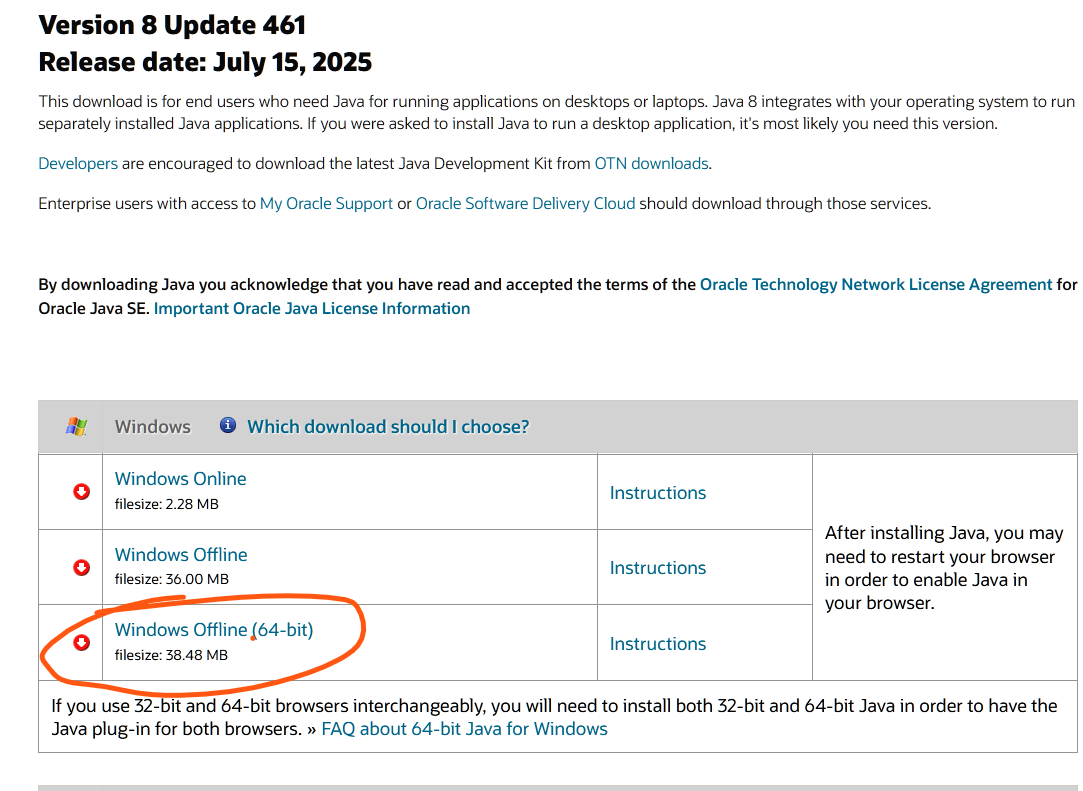 - Under Windows, choose Java 8 (Offline 64-bit) and download the installer.