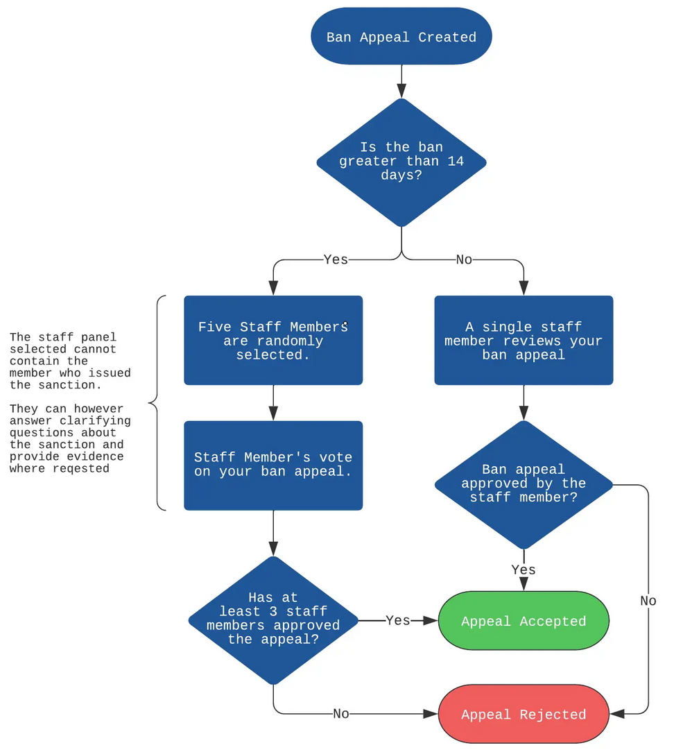 SiriusMC has a set process for dealing with all Ban Appeals, which we believe delivers a methodology that fairly evaluates every appeal. Please view the flowchart below for full details on how your appeal will be handled: